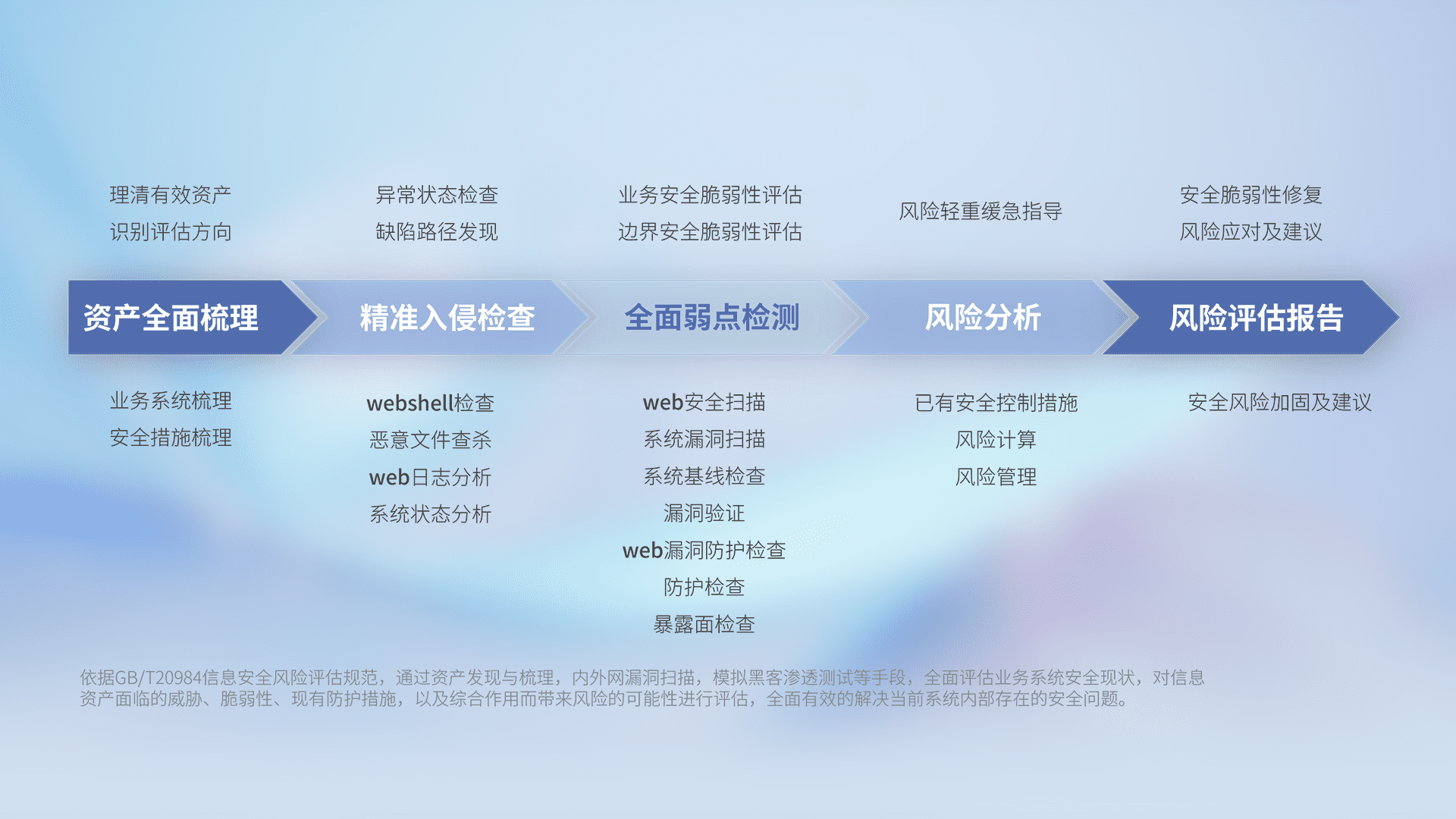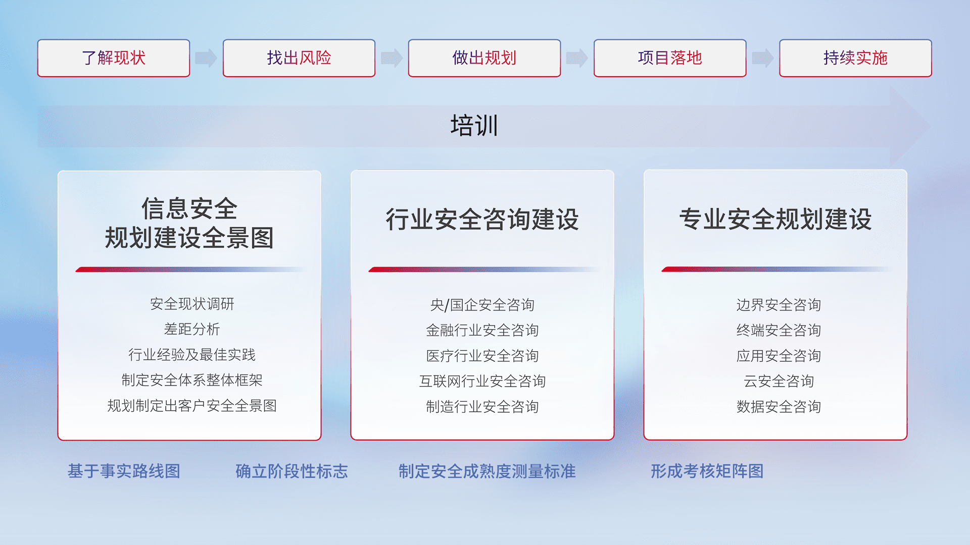 针对客户行业特性,,,,以专业的安全服务+多厂商联合解决方案提供专属的一站式安全管理服务,,,,帮助客户全面感知网络空间威胁,,,,基于识别、、检测、、分析、、防护、、、监测、、、、响应的服务理论模型,,,,从方案咨询、、、集成交付、、评估验证、、、优化加固、、、、运维运营,,致力于为客户提供完整的闭环管理式安全服务。。以实战经验为客户打造高抵御风险的安全体系,,,帮助客户发现威胁、、、对抗威胁、、处置威胁,,不断积累安全对抗能力,,持续保障数字化安全。。。。